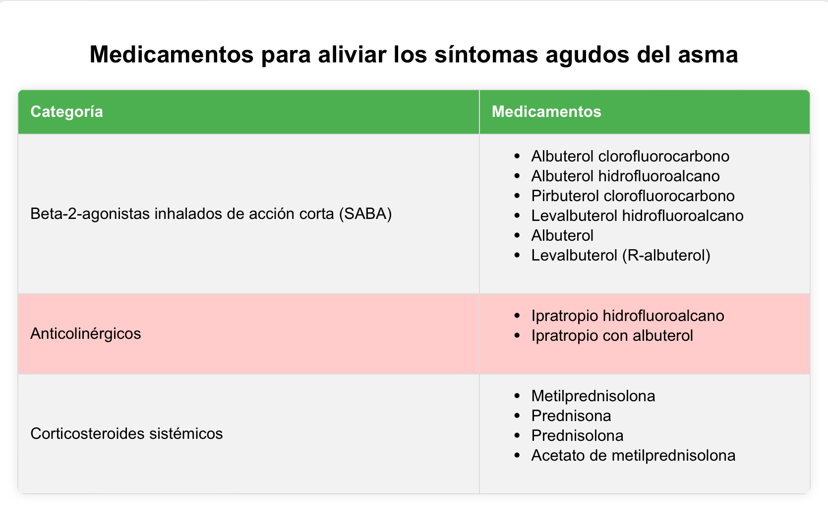 - Medicamentos para aliviar: Estos medicamentos se utilizan según sea necesario para aliviar los síntomas agudos durante los episodios de exacerbación asmática o en respuesta a desencadenantes conocidos. Su acción es rápida y se centra en la relajación de los músculos bronquiales para facilitar la expansión del flujo de aire y mejorar la respiración. La categoría principal de estos fármacos son los agonistas beta-2 adrenérgicos de acción corta (SABA), como el salbutamol y la terbutalina. Estos medicamentos se administran típicamente a través de inhaladores de dosis medida (MDI) o nebulizadores para asegurar una entrega efectiva a los pulmones en momentos de crisis asmática.