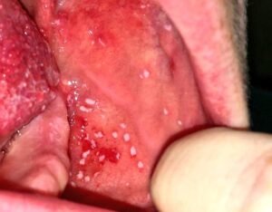 Además del exantema, el sarampión presenta otra característica diagnóstica importante conocida como las manchas de Koplik. Estas son lesiones blancoazuladas que suelen medir entre 1 y 2 mm de diámetro y están rodeadas por un halo eritematoso. Las manchas de Koplik se encuentran en la mucosa bucal y son patognomónicas del sarampión, lo que significa que son altamente indicativas de esta enfermedad. Por lo general, aparecen en los dos primeros días de síntomas y no deben confundirse con las manchas de Fordyce, que son glándulas sebáceas ectópicas que se encuentran en la boca de personas sanas y carecen del halo eritematoso característico de las manchas de Koplik.