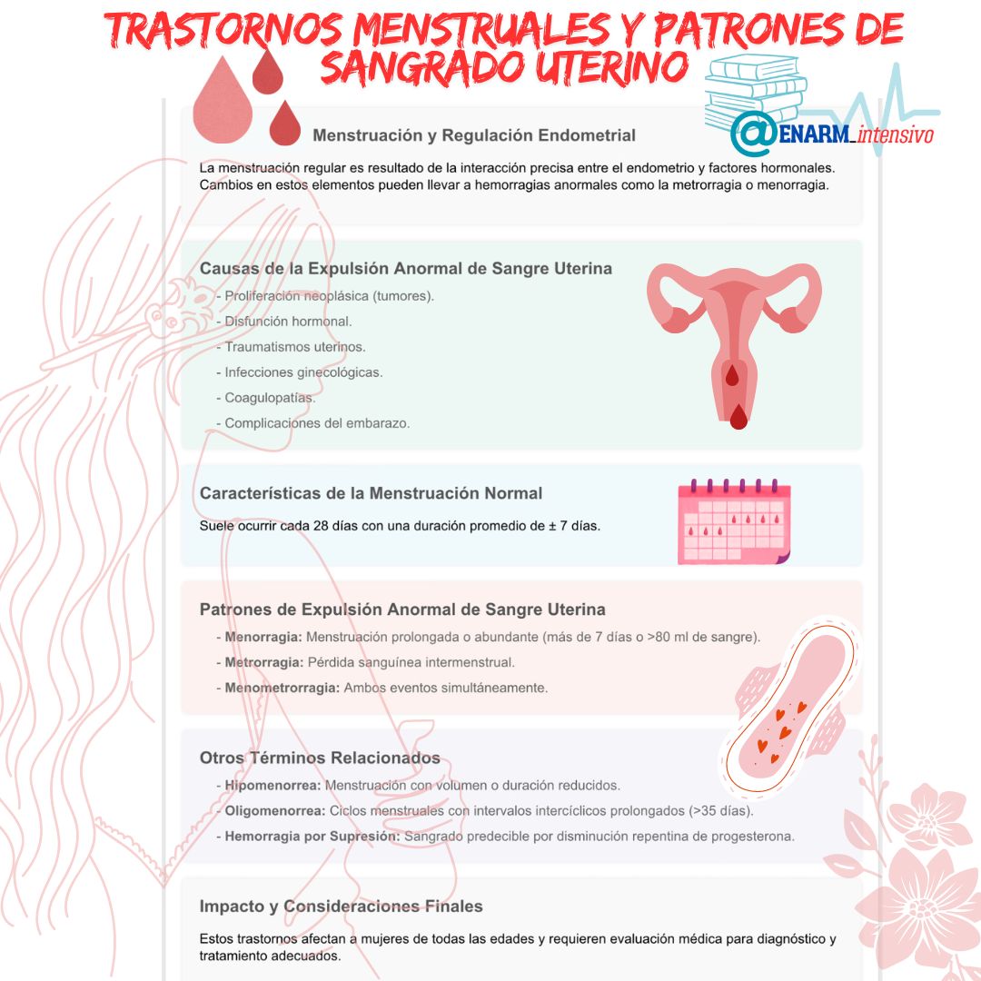 La expulsión anormal de sangre uterina puede presentar una variedad de patrones que reflejan diferentes condiciones subyacentes y mecanismos fisiopatológicos. Uno de los términos utilizados para describir estos patrones es la menorragia, que se refiere a la menstruación cíclica que es prolongada o profusa. Se considera menorragia cuando la menstruación dura más de siete días consecutivos o cuando la cantidad de sangre expulsada supera los 80 ml durante todo el período menstrual. Este trastorno puede ser indicativo de desequilibrios hormonales, como la falta de ovulación regular, o de problemas estructurales en el útero, como los fibromas uterinos, que afectan la capacidad normal del útero para regular el flujo menstrual.
