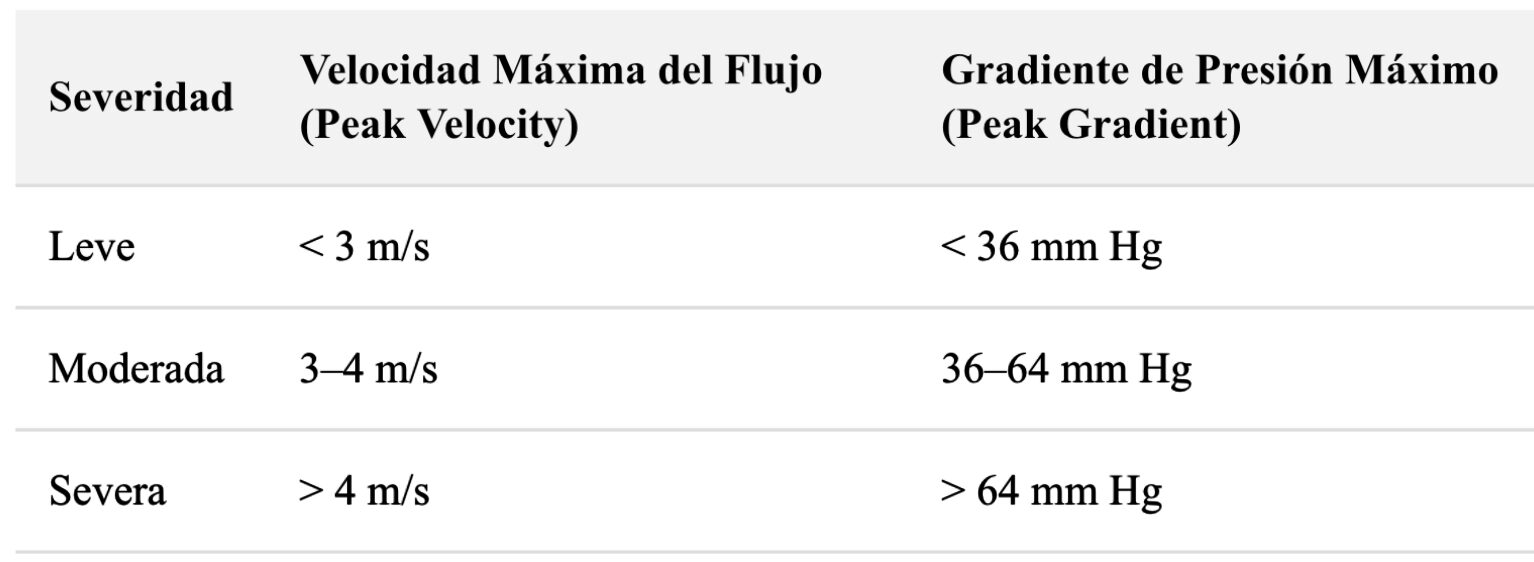 La severidad de la estenosis de la válvula pulmonar se clasifica en leve, moderada y severa basándose en dos parámetros hemodinámicos clave: la velocidad máxima del flujo a través de la válvula (peak velocity) y el gradiente de presión máximo (peak gradient) a través de la válvula. Estos parámetros son medidos comúnmente mediante ecocardiografía Doppler, una técnica no invasiva que permite evaluar el flujo sanguíneo y las presiones en el corazón.