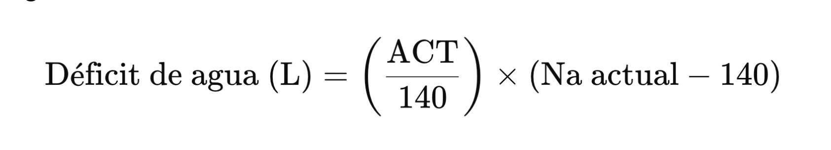 El agua corporal total (ACT) es un parámetro crucial en este cálculo, ya que está correlacionado con la masa muscular y, por lo tanto, disminuye con el envejecimiento, la caquexia y la deshidratación. En promedio, el ACT representa entre el 40% y el 60% del peso corporal. Para calcular el déficit de agua, se utiliza la siguiente fórmula:
