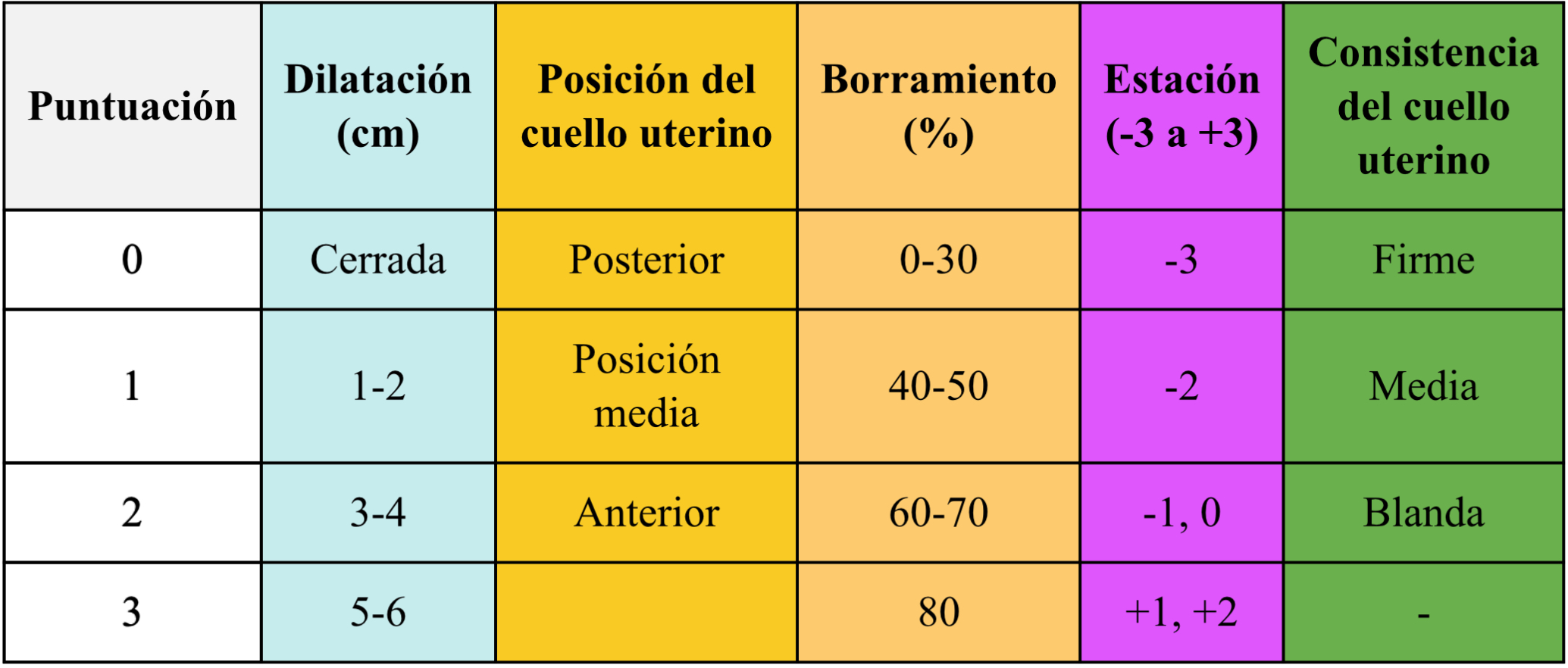 - Borrado del cuello uterino: El borrado se refiere a la reducción en el grosor del cuello uterino, medida en términos de porcentaje. Se puntúa de 0 a 3 puntos, donde 0 puntos indican un cuello uterino no borrado y 3 puntos indican un cuello uterino completamente borrado.